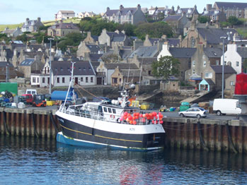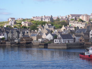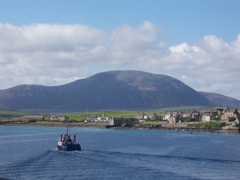 Day 1 - Jens train was cancelled in York, as too many were booked on it! The replacement arrived in Edinburgh too late for our connection to Inverness, but her taxi arrived before my train which was delayed by a points failure! How gloriously British! We had a fantastic journey on up to Thurso in sunshine & with great views, so early travel mishaps were quickly forgotten! We spent the night at Sandras Backpackers Hostel which is located above a Fish & Chip shop. It seemed rather cramped, especially the kitchen, but was quite adequate if you arrive at 10pm & leave at 8am for the ferry from Scrabster to Stromness.